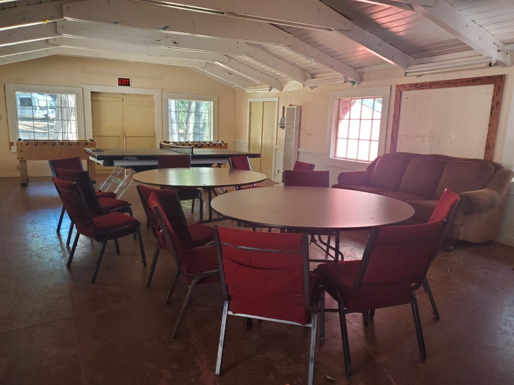 Forward Bible Camp offers several indoor and outdoor meeting spaces to accommodate various group sizes. Their chapel seats up to 120 people and is equipped with heating, air conditioning, and audio-visual capabilities. For outdoor gatherings, they have a fire circle that also accommodates up to 120. Their indoor dining area seats 50, and the outdoor dining area can seat 120. Additionally, the Harmony House provides a meeting space for smaller groups of up to 20 people.